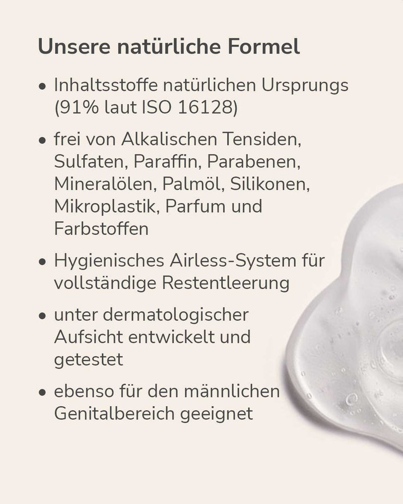 Unsere pH-hautneutrale, parfüm- und alkoholfreie Formel kommt ohne Hormone und hormonähnliche Stoffe wie Parabene aus, um mögliche Risiken hormoneller Störungen zu vermeiden. Außerdem verzichten wir auf Mineralöle, Paraffin und Silikone, damit die Haut ungehindert „atmen“ kann und keine Poren verstopft werden. So bieten wir eine besonders sanfte und sichere Pflege für Ihre Intimzone.