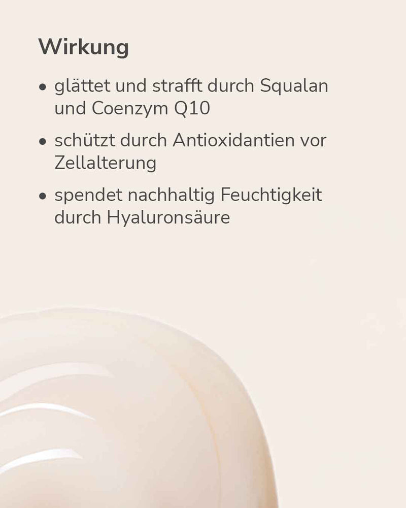 - Coenzym Q10 erhält die Gesundheit der Zellen und erhöht den Kollagenanteil der Haut.